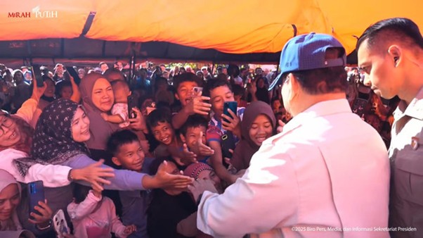 Prabowo berkeliling ke sejumlah tenda pengungsian, menyalami pengungsi, berbincang singkat dengan anak, bahkan memeluk anak-anak yang begitu bersemangat meski tengah dihantam bencana.