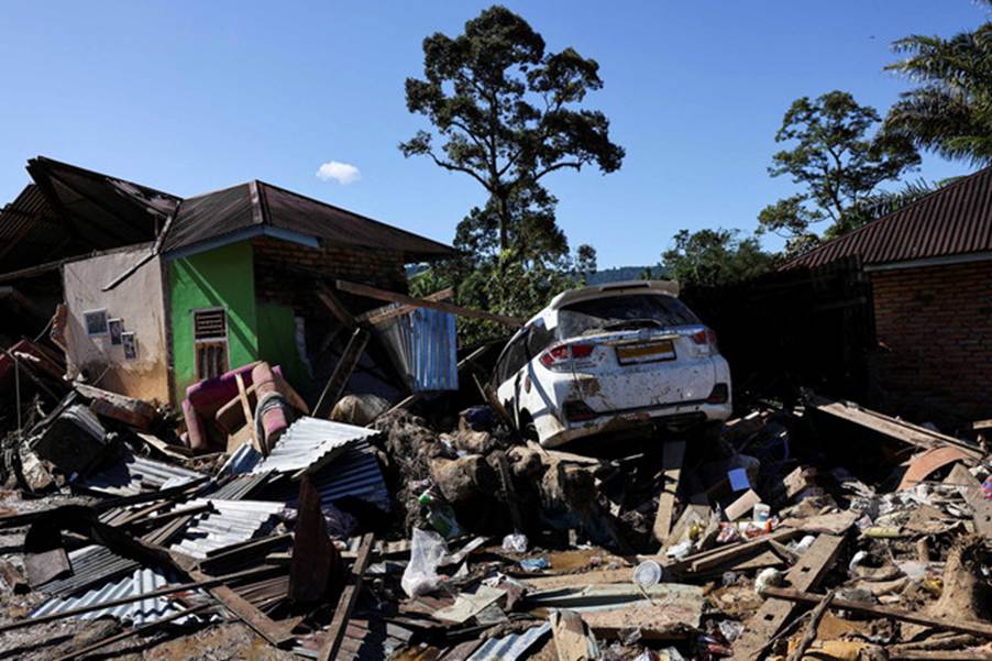 Sebuah mobil terjebak di antara puing-puing di daerah yang dilanda banjir bandang mematikan setelah hujan deras di Palembayan, Kabupaten Agam, Provinsi Sumatera Barat, Senin (1/12/2025). Foto: Willy Kurniawan/REUTERS