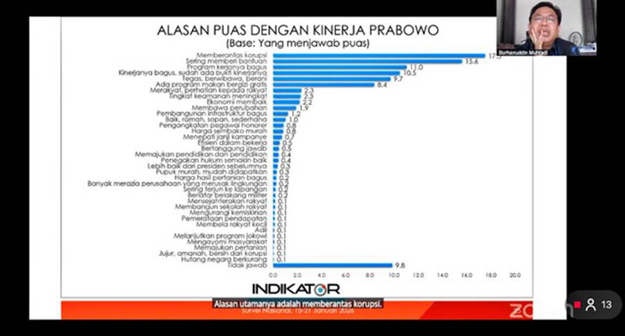 Ia menilai, persepsi pemberantasan korupsi sebagai alasan kepuasan merupakan temuan yang relatif baru dalam penilaian publik terhadap Prabowo.